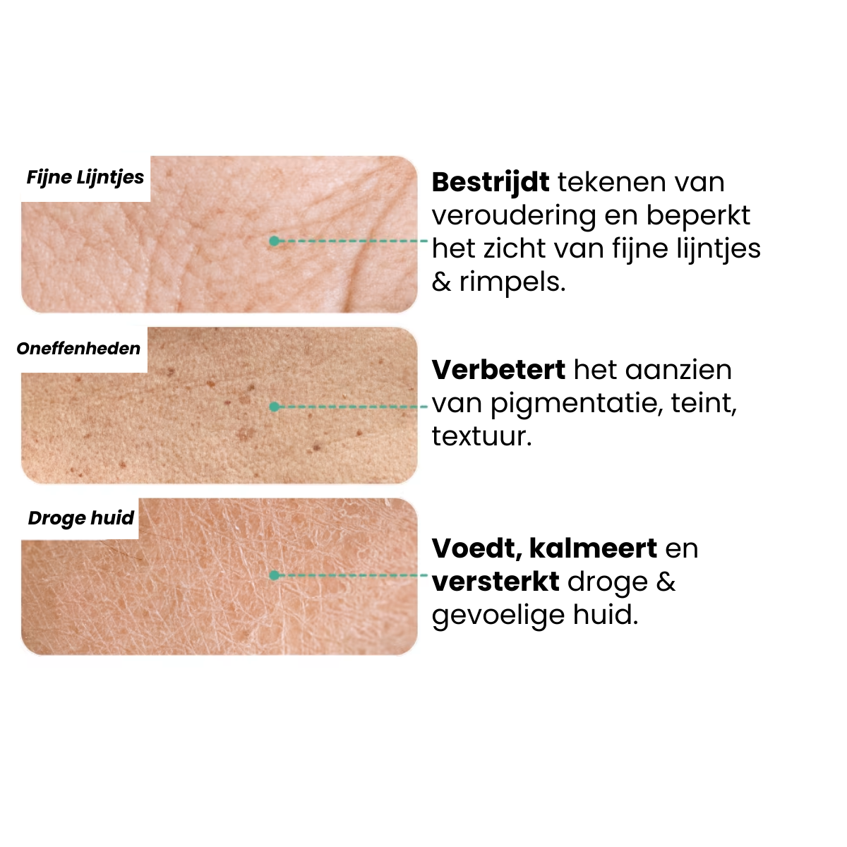 ✅ Verstevigt & herstelt je glow — helpt zichtbaar tegen lijntjes, slapper wordende huid en pigmentvlekken.